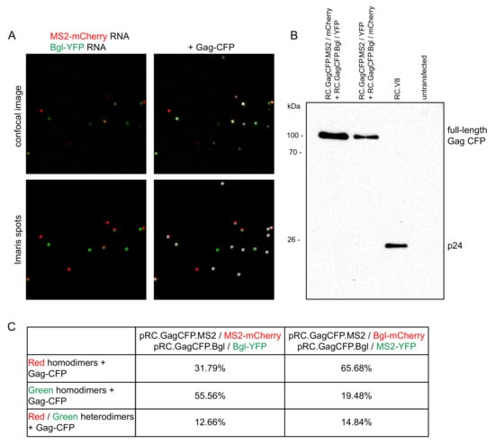To determine whether RSV has a packaging preference for genome homo- or heterodimers, single virion imaging analysis was performed [30,32]. Equivalent amounts of proviral plasmid DNA (pRC.GagCFP.MS2 and pRC.GagCFP.Bgl) and their respective fluorophore-fused coat proteins were co-expressed in QT6 cells. The genomes were identical except for the sequence of the RNA stem-loop cassettes inserted. Twenty-four hours post-transfection, virions were harvested from the supernatant and concentrated through a sucrose gradient. The proviral constructs contain Gag-CFP, so we used the CFP channel to detect virus particles (Figure 4A). Only red and green foci that colocalized with a Gag-CFP focus were considered for analysis to ensure that only genome dimers within virus particles were counted. Assuming that each virion contains two copies of genomic RNA, red-green colocalized foci were considered to be genome heterodimers and single-color foci were considered to be genome homodimers [30,32]. Virus budding was confirmed by immunoblotting (Figure 4B). In the proviral constructs, the CFP was fused to Gag between the NC domain and protease, resulting in loss of protease activity and lack of maturation of Gag products. Previous studies have already verified that minimal indiscriminate binding occurs between the MS2 and Bgl RNA labeling systems [30,31].
