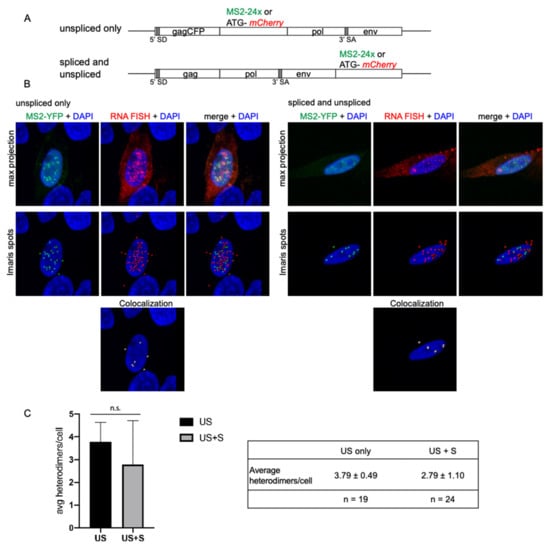 On a single cell basis, the average number of heterodimers per cell was 3.79 ± 0.49 for unspliced vRNA and 2.79 ± 1.10 for spliced plus unspliced vRNAs (n = 19 cells and 24 cells, respectively; p = 0.2132; Figure 5C). These data demonstrated that there was no significant difference in genome heterodimer formation when only unspliced vRNA was detected compared to labeling both spliced and unspliced vRNAs, suggesting that spliced vRNAs do not contribute to vRNA heterodimer formation within cells to a significant degree.