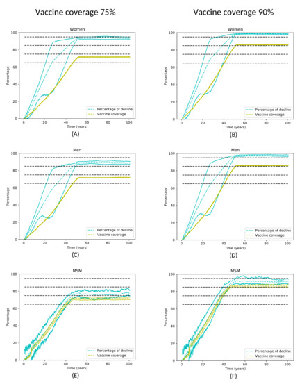 Here, we considered the vaccination program with equal coverage for boys and girls of 75% and 90%. The decline in oncogenic HPV infection is an indicator of whether the related cancers can be eliminated. We can also estimate when levels of decline of 65%, 75%, 85%, and 95% are reached by women, men, and MSM.