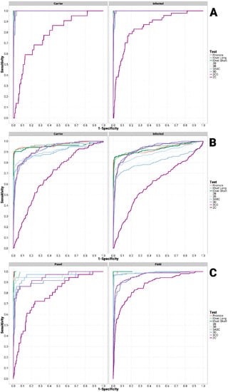 The performance of individual in-house tests was estimated from the area under the curve (AUC) and further compared with the PrioCHECK® FMDV NS and two versions (short and long incubation) of the IDvet® FMDV NS (Figure 1). For detecting infection and/or carrier status in unvaccinated infected animals, all the tests, except the 2C, performed very well (AUC range of 0.99) and no significant differences were observed between the individual in-house tests and both the PrioCHECK® FMDV NS and IDvet® FMDV NS tests (p > 0.05) (Figure 1, Table 2). Although the 2C test (AUC = 0.85) showed good results for the detection of infection in unvaccinated cattle, the test did not show good performance (AUC = 0.77) in detecting carrier animals (Figure 1, Table 2).
