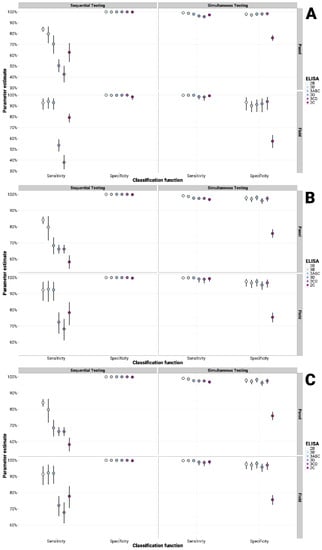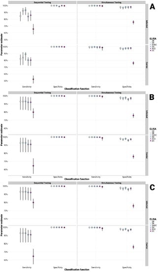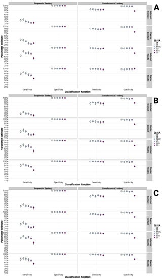 Considering all the groups tested, all in-house tests (with the exception of the 2C) showed an improved sensitivity when employed simultaneously (parallel testing) and an improved specificity when applied sequentially (serial testing) with both the PrioCHECK® FMDV NS and IDvet® FMDV NS tests, although at the expense of the other diagnostic parameter (Figure 2, Figure 3 and Figure 4). Similarly, either the sensitivity or the specificity could be increased at the cost of the other parameter compared to use of the PrioCHECK® FMDV NS test or IDvet® FMDV NS tests alone. When using a single commercial ELISA test (either the PrioCHECK® FMDV NS or the IDvet® FMDV NS test) but employed in a serial or parallel diagnostic scheme while changing the cut-off, thus adjusting the sensitivity and specificity of the test accordingly, the obtained diagnostic performance ranges were not as improved as by using different tests based on different NSPs (Supplementary Table S2). This was found to be true for all the sample categories.
