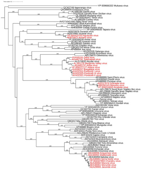 To assess possible reassortant phleboviruses, amino acid sequences of the RdRp and correspondent M segments have been retrieved from GenBank and aligned with MAFFT [12]. The percentage of identity has been evaluated with MegaX software, using p-distance with a pairwise deletion option [13]. A maximum likelihood phylogenetic tree was obtained with the RdRp aligned using IQtree software [14]. In this tree, in Figure 1, sequences with more than 95% identity, then ascribable to a single species, are highlighted in red.