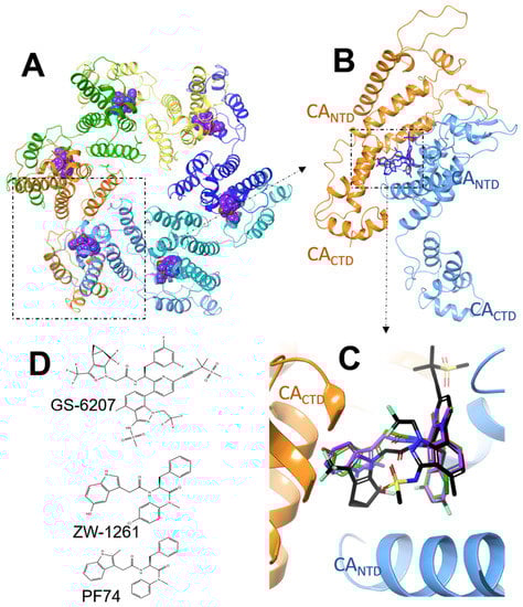 (A): Crystal structure of PF74 (purple) bound at the dimeric interface of a CA hexamer. (B): Crystal structure of GS-6207 (black), ZW-1261 (green), and PF74 (purple) bound at the dimeric interface of two CA monomers. (C): The binding site of the ligands at the NTD−CTD interface in a CA dimer. (D): Chemical structures of GS-6207, ZW-1261, and PF74.