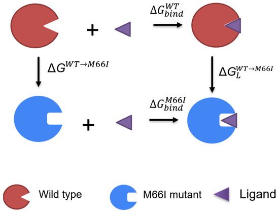 The FEP+ program [37] from the Schrödinger Suite 2020-4 [38] was also used to calculate the relative binding free energies of the wild-type and mutant M66I. The wild-type complexes were prepared with Protein Preparation Wizard [39]. For every wild-type complex and its corresponding mutant, the FEP Protein Mutation for ligand Selectivity GUI [37,38] in Maestro Suite [40] was applied to build a perturbation map. The initial structure of the apo mutant was prepared by deleting the ligand from the corresponding complexes and equilibrating the resulting structure in a solution for 20 ns, using the Desmond module.