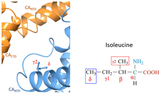 Structure of the apo pocket of the M66I CA mutant from MD. Isoleucine 66 is illustrated by the ball and stick. One CA monomer is illustrated by the blue cartoon, while the neighboring CA monomer is illustrated by the orange cartoon.