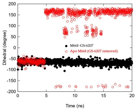We then compared the MD structures of the M66I CA mutant in complex with GS-6207, ZW-1261, and PF74 (Figure 5). While the I66 side chain in the M66I−ZW-1261 or PF74 complexes essentially maintained the same rotamer state as that of the one in the apo protein in Figure 3, in the M66I−GS-6207 complex the I66 side chain moved to a new, higher-energy rotamer, with the γ2 carbon and δ carbon switching positions. To show that this new conformer in the M66I−GS-6207 complex was indeed of s higher free energy, we performed the following sets of MD simulations: (1) starting from the structure of the M66I−GS-6207 complex but with the ligand removed from the binding pocket; (2) starting from the structure of the M66I−GS-6207 complex; (3) starting from the structures of the M66I−ZW-1261 and M66I−PF74 complexes with the ligands removed from the binding pocket; and (4) starting from the structures of the M66I−ZW-1261 and M66I−PF74 complexes. Figure 6, Figure 7 and Figure 8 show the dihedral angle of I66 as a function of the simulation time during a 20 ns MD for each of the four simulations. As seen in Figure 6, when GS-6207 is removed from its complex with the M66I CA mutant, after ~5 ns the torsion of the I66 side chain spontaneously switches to the conformation in the apo mutant (shown in red) and maintains that rotamer state during the remaining ~15 ns of the MD trajectory. Although this χ1 torsion occasionally visits conformations in the 50~100 degree region during the ~15 ns MD, such metastable states are not seen in the longer MD simulation (data now shown). In contrast, in all other simulations the torsion of I66 remains in the same starting rotamer state during the entire MD.