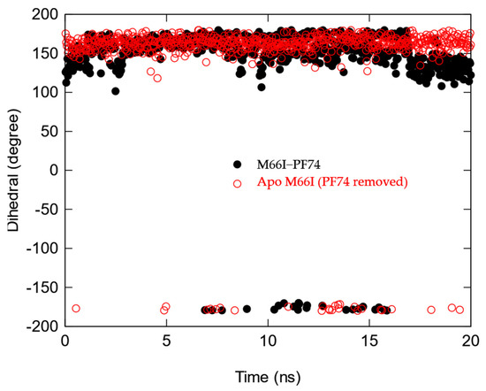 Time course of the torsion in the side chain of I66 of the M66I CA mutant after the PF74 is manually removed (red), M66I−PF74 complex (black).
