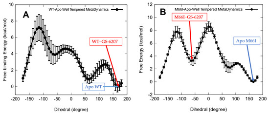 Free energy profiles along the dihedral angle of the side chain of residue 66 in (A) apo wild-type CA and (B) apo M66I mutant.