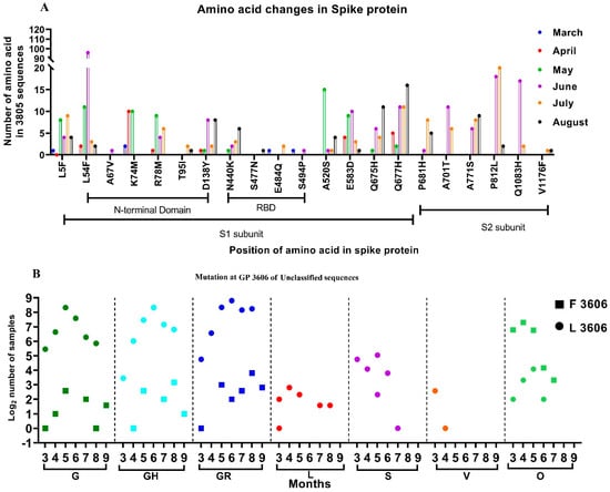 Month-wise changes in the mutations observed in SARS-CoV-2 sequences: (A) Month-wise changes in the amino acid mutations in the spike protein that were observed in more than 0.5% of the samples studied. (B) Month-wise changes in the Leucine and Phenylalanine amino acids at GP 3606, position 3606, observed within different clades.