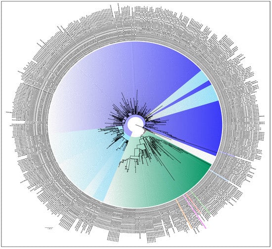 - Kumar, S.; Stecher, G.; Tamura, K. MEGA7: Molecular Evolutionary Genetics Analysis Version 7.0 for Bigger Datasets. Mol. Biol. Evol. 2016, 33, 1870–1874. [Google Scholar] [CrossRef]