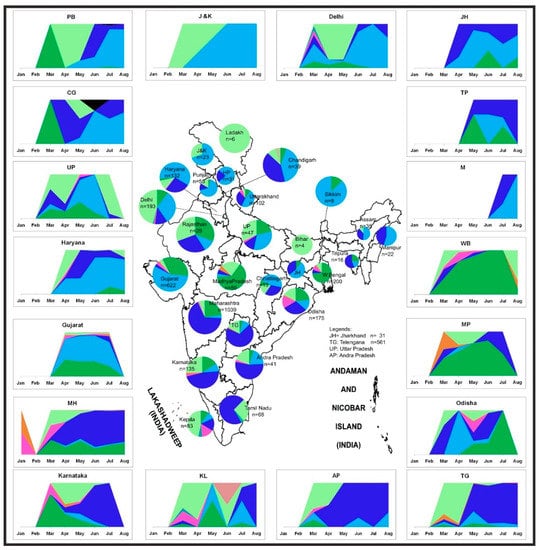 Distribution of the SARS-CoV-2 genome prevalence from the outbreak phase (January 2020) up to the seventh month of the pandemic. Stacked area plots are generated to demonstrate the cumulative temporal trends of the SARS-CoV-2 observed in the different states in India. The x-axis depicts the number of SARS-Cov-2 sequences observed in the respective months. The size of each pie chart within the states of the Indian map is proportional to the numbers in each respective clade. The outline of India’s map is downloaded from http://www.surveyofindia.gov.in/file/Map%20of%20India_1.jpg (accessed on 20 March 2020) and further modified to include relevant data in the SVG editor.