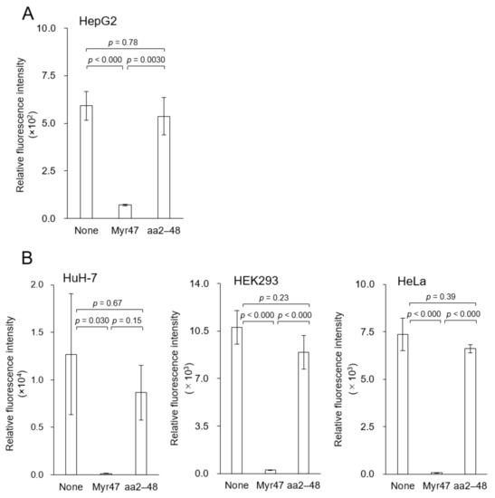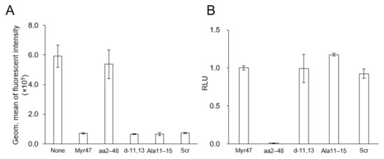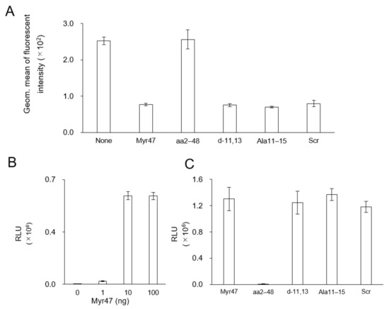 3.3. Effect of Amino Acid Sequence on the Myr47-Mediated Inhibitory Activity