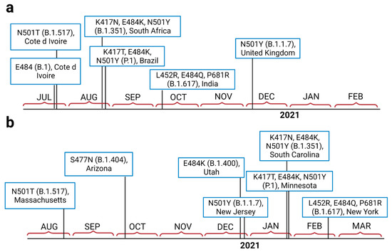 As of January 13, 2021, approximately 76 cases of B.1.1.7 have been detected in different states of the U.S. [18]. B.1.351 and P.1 have also been detected at the end of January 2021 [37,38]. Our timeline analysis also confirmed that variants carrying N501Y mutation (B.1.1.7, B.1.351, and P.1) have emerged between the end of 2020 and the beginning of 2021 in the U.S. (Figure 1). Analysis of SARS-CoV-2 genotypes from California revealed that a new variant called B.1.429 (CAL.20C) was first observed in July 2020 in 1 out of 1247 samples from Los Angeles County; thereafter, this variant’s prevalence has increased to 35% and 44% in California state and Southern California respectively in January 2021 [39]. A recent study reported the presence of other important SARS-CoV-2 variants, but at low rates (B.1.1.7; 23 cases, B.1.351; 2 cases, P.1; 4 cases and two closely related Cal.20C variants; B.1.429; 143 cases and B.1.427; 19 cases) among 20,453 virus specimens from COVID-19 patients dating from December 2020 through mid-February 2021, in the Houston metropolitan region [40]. The novel variant B.1.617 emerged at the beginning of October 2020 from India and was detected in late February 2021 in the U.S. (Figure 1), which is also consistent with the first report of this variant [19,20].