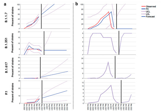 The forecast models of the proportion of different novel SARS-CoV-2 variants in North America. (a) Model 1 pre-vaccination, (b) model 2 post-vaccination and assumption of occurrence of herd immunity (modeled based on the affinity of neutralizing antibody to the S-RBD protein of B.1.1.7, B.1.617, B.1.351, and P.1 variants).