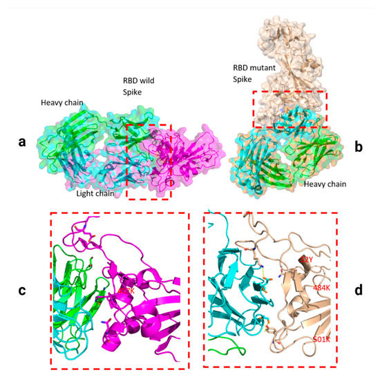 Docking structures of the interaction of SARS-CoV-2 S-RBD protein in complex with a potent neutralizing CV30 antibody. The structure of interactions of the wild S-RBD protein with neutralizing CV30 antibody (a,c). Docking structure of interactions of mutant S-RBD protein with neutralizing CV30 antibody (b,d).