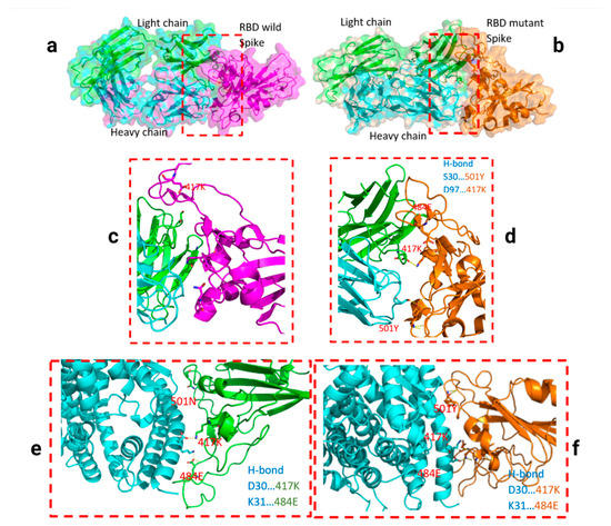Docking structures of the interaction of SARS-CoV-2 S-RBD protein in complex with a potent neutralizing CV30 antibody. The structure of interactions of wild S-RBD protein with neutralizing CV30 antibody (a,c). Docking structure of interactions of mutant B.1.1.7 S-RBD protein with neutralizing CV30 antibody (b,d). The structure of interactions of wild S-RBD protein with human hACE2 (e). The structure of interactions of mutant B.1.1.7 S-RBD (N501Y) protein with human hACE2 (f). The dashed line indicates the hydrogen bond.