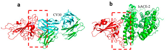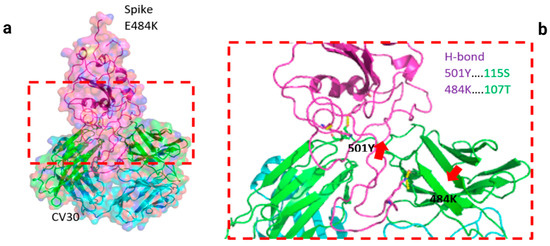 Docking structures of the interaction of P.1 mutant SARS-CoV-2 S-RBD protein in complex with a potent neutralizing CV30 antibody (a) and hACE2 (b). The dashed line indicates the hydrogen bond.