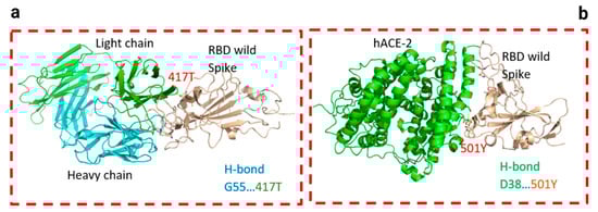 Docking structures of the interaction of B.1.351 mutant SARS-CoV-2 S-RBD protein in complex with a potent neutralizing CV30 antibody (a) and hACE2 (b). The dashed line indicates the hydrogen bond.