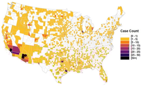 West Nile virus (WNV) is the most common arthropod borne virus (arbovirus) in the United States (US) and is the leading cause of viral encephalitis in the country []. Since the first US identification in New York of 1999 [], WNV has spread from Canada to South America, and autochthonous transmission has occurred in every state in the continental US [,]. During this period, West Nile Disease (WND) has affected tens of thousands of US persons, with thousands of new cases continuing to be reported annually []. WND is clinically described as either non-neuroinvasive or neuroinvasive, with non-neuroinvasive being characterized by relatively minor symptoms (headache, myalgias, and gastrointestinal discomfort) and neuroinvasive disease presenting with aseptic meningitis, encephalitis, or acute flaccid paralysis []. Although the majority of persons infected with WNV are asymptomatic, about 25% of those infected experience flu-like symptoms, and approximately 1% of these cases progress to acute neuroinvasive disease with severe encephalitis and a risk of death [,,]. Due to the high incidence of asymptomatic cases and uneven testing across the US, tracking and forecasting WNV occurrence and WND spatial and temporal spread has been problematic [].