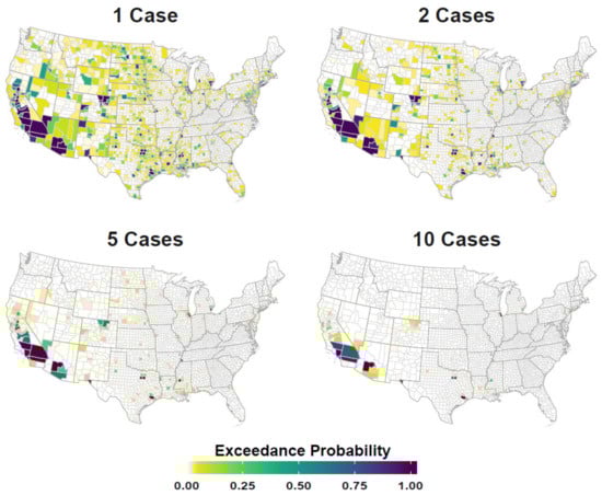 Case exceedance probability. Figure displays the probability of counties having more than 1, 2, 5, and 10 neuroinvasive disease cases annually. Maps are color coded such that darker tones (deep blues) indicate higher exceedance probabilities (0.00–1.00) and lighter colors (greens and yellows) represent relatively lower probabilities.
