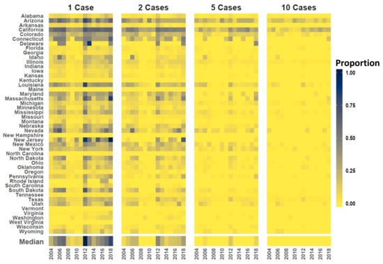 State case counts. Vertical axis at left lists US State names (aligned as rows) and horizontal axis shows time (year). Color code indicates the proportion counties in each state estimated to experience 1, 2, 5, and 10 cases. Dedicated panels are provided from left to right for 1, 2, 5, and 10 cases, respectively. Darker tones indicate a relatively high proportion of counties in the state are subject to the given case count and lighter tones signify a lower proportion. Color coded bar parallel to horizontal axis gives the median proportion of US Counties subject to each case threshold.