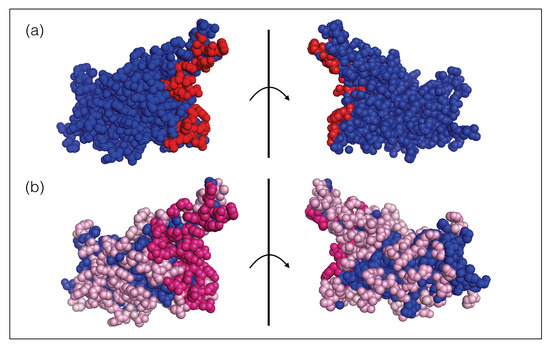 Receptor binding domain of the SARS-CoV-2 spike protein (PDB code 6M0J). The two views are related by a 180 rotation with respect to the plane (shown as a vertical line) representing the ACE2 binding interface. (a) The ensemble of residues that bind to ACE2 are colored in red spheres and the other residues are in blue. (b) The ensemble of epitope residues targeted by at least one nAb and less then ten nAbs of the set are in light pink spheres, those targeted by ten or more nAbs are in dark pink spheres and the other, non-epitope, residues are in blue. The list of epitope residues and ACE2 binding sites can be found in our GitHub repository (https://github.com/3BioCompBio/SpikeProSARS-CoV-2/blob/main/Structures/Epitope.dat, accessed on 10 April 2021).