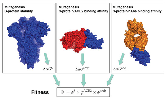 The SARS-CoV-2 fitness, defined qualitatively on the basis of its efficiency to produce infectious progeny [37], is complicated to define quantitatively [38]. It depends in a complex manner on a series of features, among which the transmissibility of the virus between hosts, the infectivity of the host and the ability of the virus to escape from the host’s immune response [39]. We thus approximated the global SARS-CoV-2 fitness as a product of three fitness contributions , and , which describe the transmissibility, infectivity and escape features, respectively (Equations (1)–(4)). In addition, we focused exclusively on the impact of variants of the spike protein. We estimated the three fitness contributions , and in terms of the change in folding free energy upon mutation of the spike protein (), the change of its binding affinity for ACE2 () and the change of its binding affinity for a set of nAbs (), using statistical physics-based approaches and more specifically the PoPMuSiC [34] and BeAtMuSiC [35] algorithms, as detailed in Section 2.2, Section 2.3, Section 2.4. Note that the effect of multiple mutations on the fitness were considered as independent and thus simply multiplied (Equation (4)).
