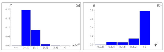 To analyze the relation between stability predictions and epidemiological data, we compared the computed spike protein stability changes with the observed mutation rate . We estimated as the number of occurrences of each point mutation i in the set of about SARS-CoV-2 spike protein sequences collected in the GISAID database [46], divided by the number of residues in the spike protein. We analyzed as a function of the predicted values for all possible mutations i in the whole spike protein. As seen in Figure 3a, the majority of mutations that became dominant during the evolutionary trajectory show a slight increase in the spike protein stability, with between −1 and 0 kcal/mol. A smaller number of dominant variants have their stability slightly decreased with between 0 and 1 kcal/mol. Outside of this free energy interval, the rate almost vanishes.
