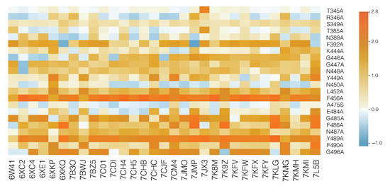 HeatMap of the predicted values for each of the 31 nAb/spike protein complexes from the set . The color scale is shown on the right (in kcal/mol). Light blue corresponds to variants that slightly stabilize the complex and orange, to mutations that destabilize the complex. The most destabilizing mutations are likely to lead the virus to escape from the immune system.