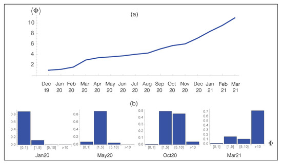 We analyzed in more detail the evolution of the partial distribution function of the per-month averaged fitness in Figure 6b. In January 2020, the population was dominated by the wild type strain whose fitness is by definition equal to one. The effect of the D614G spike protein variant with a predicted started to be observed from May 2020, while in October of the same year, additional mutations with , such as A222V, started to be fixed in the population, leading to a further increase in . In March 2021, the distribution became dominated by new variants, i.e., UK, South-African and Brazilian variants, with a much higher fitness than both the wild-type and D614G strains.