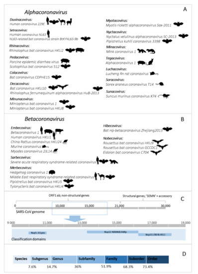 (A,B) Current coronavirus subgenera (bold) and species of the Alphacoronavirus and Betacoronavirus genera. The images indicate host species associated with the virus species. Figure constructed with the species listed on the 2019 Release of the ICTV Virus Taxonomy 9th Report MSL#35: (Available at https://talk.ictvonline.org/ictv-reports/ictv_9th_report/positive-sense-rna-viruses-2011/w/posrna_viruses/222/coronaviridae accessed on 12 December 2020). (C) Representation of the coronavirus genome (based on the reference genome NC_004718.3 SARS coronavirus Tor2) depicting the locations of important domains for classification of species (NSP5 (3CLpro), NSP12 (NiRAN and RdRp), and NSP13 (ZBD and HEL1)). (D) Thresholds of the taxonomic demarcation criteria [24]. Novel viruses are part of a taxonomic level if the divergence within the five concatenated replicase domains is less than the indicated amino acid percentage.