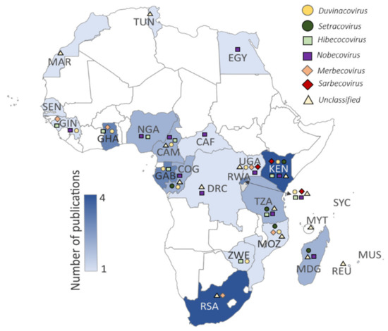 The high biodiversity on the African continent supports viral species richness, which has been correlated with disease hotspot mapping and novel viral diseases that have emerged or re-emerged in Africa to date [22]. Many communities in Africa live in close contact with wildlife, domesticated animals, and livestock. Some surveillance for bat coronaviruses has been performed in Africa. A recent review by Markotter et al. [23] provides a comprehensive summary of potentially zoonotic coronaviruses reported from Africa (relatives of HCoV229E, HCoVNL63, MERS-CoV, and SARS-CoV), focusing on the distribution of the host bat species, and concluding that inferences on zoonotic potential based on the genetic relatedness is limiting. This review focuses in greater detail on the total coronavirus diversity identified among African animal species. We review published literature concerning bat species targeted, sample sizes, viral genetic diversity, and evolutionary links to specific host species. The review was also expanded to include the currently available surveillance data among non-bat wildlife and domesticated livestock as hosts of coronavirus diversity. We highlight surveillance approaches from previous studies, important findings, and gaps in current surveillance and propose a surveillance framework to guide the design of future biosurveillance studies.