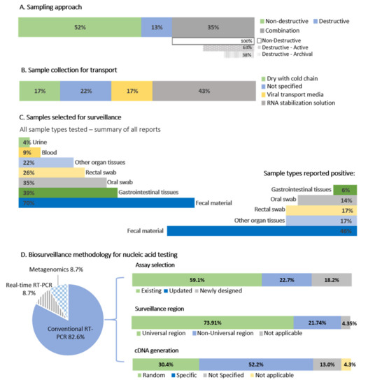 Overall, it is not possible to directly compare methodologies to conclude best practices for coronavirus surveillance. However, non-destructive sampling methodologies (swab collection or fecal material from underneath roosting bats) associated with a gastrointestinal origin allow for successful coronavirus identification with minimal injury to the hosts or ecosystem. Proper preservation of sample material is good practice (cold chain or using preservation media), and unbiased cDNA preparation approaches allow for the conservation of reagents and sample material. The use of appropriate assays and overlapping target regions are essential to enable comparisons between studies.