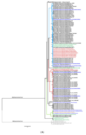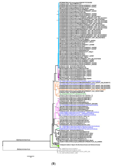 Short sequence lengths may hamper the resolution of a phylogeny, resulting in poor support for certain clades. The phylogenies in Figures S1 and S2 (and Figure 5 and Figure 6) were constructed to include as many African bat coronavirus sequences as possible while still allowing for sequence lengths that would yield well-supported clades. Therefore, sequences that would have resulted in alignments of less than 200 nucleotides were omitted with final lengths between 260 and 294 nucleotides, respectively. For simplicity, all sequence names were converted to the standardized convention with the modification of listing unique sequence identifiers last. Sequences were obtained from Genbank (NCBI) by searching the accession numbers listed in the publications identified as described in Table 1, or manually searching for the publication title. The accession numbers of all sequences included are provided in the phylogenetic trees. Sequence alignments and editing were performed with ClustalW in Bioedit [151]. Maximum clade credibility trees were constructed using suggested models selected from jModelTest2.org [152]. Phylogenetic analyses were performed with Bayesian phylogenetics using BEAST v. 1.10 using the general time-reversible model (GTR) plus invariant sites and gamma distribution substitution model [153]. The CIPRES Science Gateway was used to run computationally expensive analyses such as alignments, jmodeltest, and BEAST [154]. The Bayesian MCMC chains of the alphacoronavirus phylogeny was set to 20,000,000 states, sampling every 2000 steps, and the betacoronavirus phylogeny was set at 25,000,000 states (sampling every 2500 steps). Final trees were calculated from the 9000 generated trees after discarding the first 10% as burn-in. Trees were viewed and edited in Figtree v1.4.2.