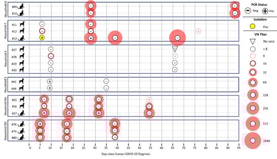 Among animals in multi-pet households (Figure 2), there are some instances where all animals were negative by PCR yet positive by VN. For example, both cats from household D were PCR-negative yet VN-positive and were sampled 27 days after owner diagnosis. In household K, all four dogs were PCR-negative, and one was VN-positive, and they were sampled 10 days after owner diagnosis. In the three multi-pet households, each had a single cat test PCR-positive at the initial visit with neutralizing antibodies found in one out of three (household E; sampled 6 days after owner diagnosis) and in three out of three pets at the second sampling (household AA; sampled 7 days after owner diagnosis, and household OO; sampled 5 days after owner diagnosis).