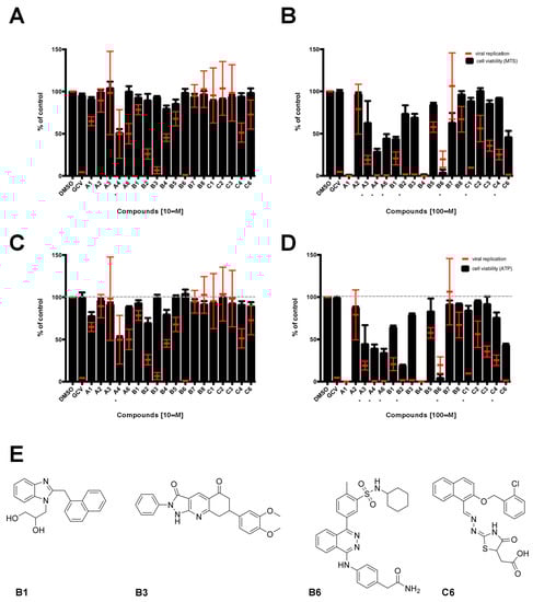 Identification of compounds interfering with HCMV replication. MRC5 cells were infected with TB4-UL83-EYFP at an MOI of 0.03 IU/cell and treated with each SM either at concentration of 10 μM (A,C) or 100 μM (B,D). In parallel, uninfected MRC5 cells were also treated for assessment of SMs cytotoxicity. Seven days post treatment, cells were processed for data acquisition and analysis as described in the Materials and Methods section. Mean YFP values relative to infected cells treated with the indicated SMs are expressed as a percentage of DMSO-treated cells (red bars). Cell viability was assessed by MTS (A,B) or Cell Titer Glo® assays (C,D), and data expressed as a percentage of DMSO-treated cells (black columns). The mean + standard error of the mean (SEM) relative to 3 independent experiments is shown. * indicates the presence of precipitates. (E) The chemical structure of active molecules is shown.