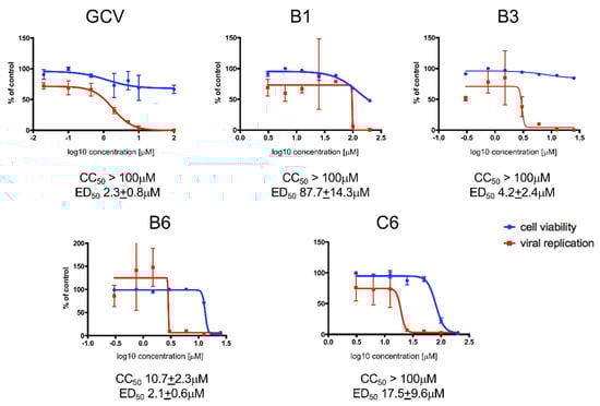 Afterwards we determined Effective Dose (ED50) and Cytotoxic Concentration (CC50) values of each of the four SMs identified in our small-scale FRA-based screening (i.e., B1, B3, B6 and C6). To this end, we performed dose-response FRAs and MTT assays in MRC5 cells treated with increasing concentrations of each SM. Importantly, all SMs tested reproducibly inhibited viral replication in a dose-dependent manner, with ED50 values in the low micromolar range (Figure 3). As expected, GCV efficiently inhibited HCMV replication with a ED50 of 2.3 ± 0.7 μM and did not cause detectable cytotoxic effects at any concentration tested. Among the SMs tested B6 was the most potent compound and exhibited an ED50 slightly lower that that calculated for GCV (2.1 ± 0.6 μM). However, it was also endowed with considerable cytotoxicity (CC50 of ~10 μM), resulting in a poor selectivity index (SI) < 5. On the other hand, B3, the second most potent SM (ED50 of 4.2 ± 2.4 μM), did not cause evident cytotoxicity up to 100 μM, and therefore the SI resulted > 20. C6 also exhibited low cytotoxicity, but was significantly less efficient in inhibiting HCMV replication than the other two SMs (ED50 of 17.9 ± 9.6 μM), and cell morphology appeared significantly altered upon microscopic evaluation (not shown). Finally, the effect of B1 on HCMV life cycle was evident only at high concentrations (ED50 of 87.7 ± 14.3 μM).