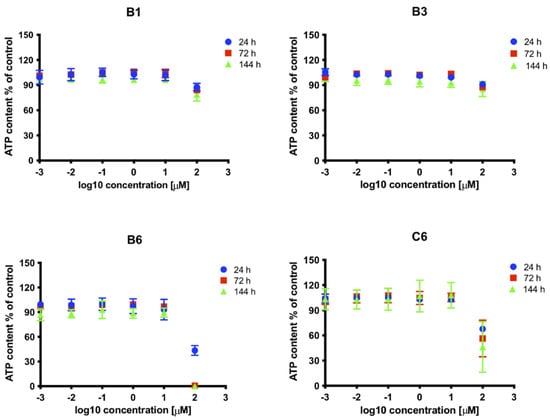 To further investigate the effects of each SM on cell viability and growth, we quantified the ATP levels in MRC5 cells treated with increasing concentrations, and cultured for different times (Figure 4). Results confirmed high toxicity of compound B6, which reduced ATP intracellular levels by more than 50% at 100 μM already at 24 h post treatment and by almost 100% at 72 h post treatment. Importantly, cell treatment with C6 at 100 μM similarly reduced ATP content by more than 30% already after 24 h, whereas compounds B1 and B3 showed minimal effects at all time points analyzed. Overall, our data indicate that SM B3 might be specifically interfering with HCMV life cycle. The effect of B3 on HCMV AD169 was also assessed by PRA assays in HFF. In such experimental setting, SM B3 inhibited HCMV replication with an ED50 of 7.9 ± 3.5 μM (Figure 5).