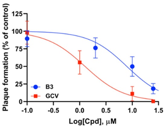 Inhibition of AD169 replication by B3 in PRA. Dose-response curves for B3 (blue) or GCV (red) were obtained by infecting HFF cells with HCMV AD169 and then treating them with different concentrations of the indicated compounds. Data shown are the means ± standard deviation of the mean relative to four independent experiments performed in duplicate.