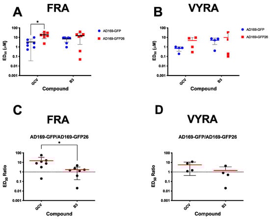 B3 efficiently inhibits replication of the GCV-resistant AD169-GFP26 virus. MRC5 were infected with either AD169-GFP virus or its GCV-resistant counterpart AD169-GFP26 at a MOI of 0.05 IU/cells and treated with increasing concentrations of the indicated compounds. At 7 days p.i., cells were lysed and plates processed for FRAs (A,C), while supernatants were collected and used for VYRAs (B,D). For the latter experiments, MRC5 cells were infected with serial dilutions of supernatants derived from infected cells. At 7 days p.i., viral titers were calculated using the TCID50 method. Data from both assays were used to calculate the ED50 relative to the two viruses (A,B) as well as the ratio between the ED50 calculated for AD169-GFP26 and AD169-GFP (C,D), for both GCV and B3. Data shown are single measurements, means, and standard deviation of the mean relative to at least three independent experiments (see Table 1), along with the p-value relative to the Student’s t-test the indicated groups; *: p ≤ 0.05.