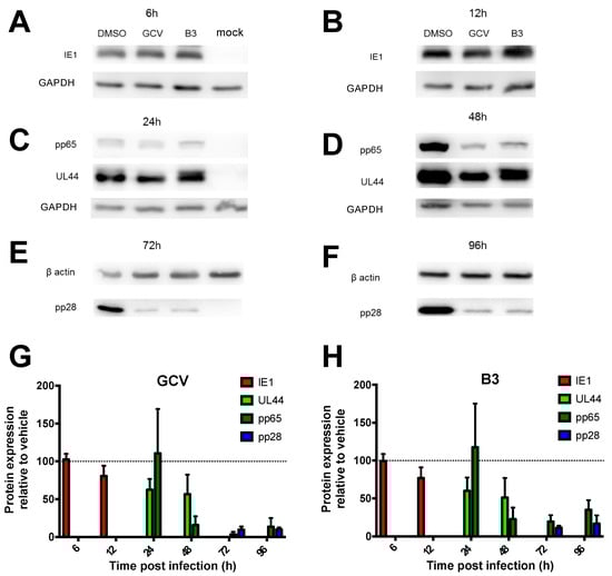 In order to characterize the mode of action of B3, MRC5 cells were infected with AD169 at an MOI of 2 IU/cell for 2 h, treated with either vehicle alone (DMSO 0.5%), GCV (16 μM) of B3 (50 μM) and expression of immediate-early (IE1), early-late (UL44 and pp65), and late (pp28) proteins was assessed at different time points p.i. In the absence of HCMV antivirals, HCMV gene expression followed the typical pattern, with IE1 being readily detectable starting from 6 h p.i., ppUL44 from 12 h. p.i. and ppUL28 from 48 h p.i. (Figure 7 and Supplementary Figure S3). As expected, neither GCV nor B3 treatment affected IE1 expression at 6 and 12 h p.i., indicating that the observed decrease in viral replication did not depend on an inhibition of activity on the major IE promoter (Figure 7A,B). Similarly, ppUL44 and pp65 levels were not affected up to 24 h p.i. (Figure 7C), confirming that IE function was not compromised. At 48 h p.i., a decrease in the expression of ppUL44 and—to a greater extent—of pp65 could be observed (Figure 7D). Importantly, both GCV and B3 treatment strongly inhibited pp28 expression at both 72 h and 96 h p.i. (Figure 7E,F). Densitometric analysis confirmed that GCV (Figure 7G) and B3 (Figure 7H) inhibited HCMV gene expression with very similar kinetics, compatible with inhibition of viral DNA synthesis and interference with an early HCMV function, possibly disrupting ppUL44 homodimers.