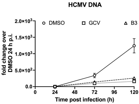 In order to investigate the effect of B3 on HCMV genome replication, MRC5 cells were infected with TB4-UL83-EYFP at an MOI of 0.01 IU/cell for 2 h, treated with either vehicle alone (DMSO 0.5%), GCV (16 μM) of B3 (50 μM) and viral genomes were quantified by qPCR at 24, 72 and 120 h p.i. In the absence of HCMV antivirals, we could detect a sharp increase of HCMV genome rapidly at 72 h and 120 h p.i. as compared 24 h p.i., indicative of active viral genome replication (Figure 8, circles). Importantly, treatment with GCV significantly reduced viral genome copy number, starting from 72 h p.i. (Figure 8, squares), consistent with inhibition of viral genome replication. Extremely similar results were obtained after treatment with B3, wherein a ~4-fold and 6-fold decrease in viral genome copy number was quantified at 72 and 120 h p.i., respectively (Figure 8, triangles). Therefore, B3 impairs HCMV life cycle by interfering with viral DNA replication.