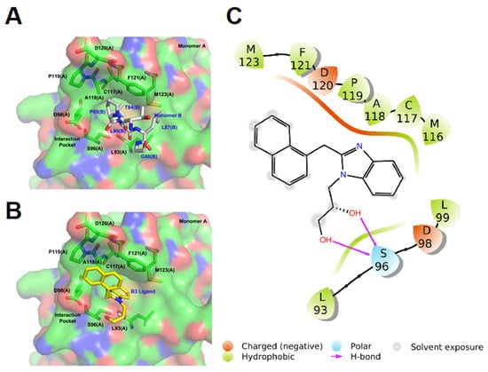 Analysis of the predicted binding mode of B3 to ppUL44 revealed that B3 can interact with the dimerization pocket of a ppUL44 monomer in place of residues L86 and L87 of the other monomer. Indeed, B3 can establish hydrophobic interactions with ppUL44 M116, C117, A118, P119, F121, M123, L99, L93, as well as two H-bond interactions with S96, occupying a very similar position to L86 and L87 of the other monomer within the pocket itself (Figure 9). Overall, all our results are consistent with the possibility of B3 interfering with HCMV genome replication by disrupting ppUL44 homodimers.