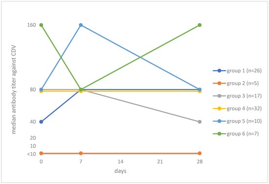 Grouping of dogs based on median antibody titers against canine distemper virus (CDV) on day 0 and changes in titer after vaccination against CDV in virus neutralization (VN) testing using isolate AG219. The antibody titers of the individual dogs are given in Table S1.