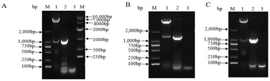 The image shows the DNA bands after Agrose gel electrophoresis; PCR amplification and restriction endonuclease digestion of His-SUMO-VP1 and VP0 in plasmid DNA. (A) Identification by PCR and double digestion of recombinant plasmid pET-32a- His-SUMO-VP1; lane 1: Double digestion product of pET-32a-HisSUMO-VP1; lane 2: PCR product; lane 3: Negative control; (B) Identification by PCR and double digestion of recombinant plasmid pET-32a- His-SUMO-VP0; lane 1: Double digestion product of pET-32a-His-SUMO-VP0; lane 2: PCR product: lane 3: Negative control; (C) Identification by PCR and double digestion of recombinant plasmid pET-32a- His-SUMO-VP3; lane 1: Double digestion product of pET-32a- His-SUMO -VP3; lane 2: PCR product; lane 3: Negative control.