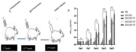 Thirty-five 6–8 week old Specific-pathogen-free (SPF) BALB/c female mice were randomly divided into five distinct groups (7 mice/group). The groups were: (A) PBS mock group; (B) His-SUMO negative control group; (C) His-SUMO-VP1 group; (D) His-SUMO-VP0 group; (E) His-SUMO-VP3 group (Table 2). On day 1, the mice were immunized with three fusion proteins, with His-SUMO and PBS as the negative and mock groups, respectively (Table 2). The mock group (group A) was injected twice, at 100 μL/mice with PBS only, through the intramuscular route. The negative control group for FMDV recombinant protein immunogenic studies was injected twice with the His-SUMO protein with complete and incomplete Freund’s adjuvants. On day 15, each BALB/c mouse in groups of (C, D, and E), which were previously injected intramuscularly with 10 μg of purified recombinant proteins emulsified in complete Freund’s adjuvant, were injected with booster vaccines with a similar dose as that of purified recombinant proteins mixed with incomplete Freund’s adjuvant. Serum samples were collected before injection and after the first and second injection where all mice bled at 0, 7, 14, 21, and 28 days. At 28 days, the sera were collected from the retro-orbital vein and mice in all groups were sacrificed according to the approved ethical protocol. The sera were collected and kept at −70 ℃ for further analysis.