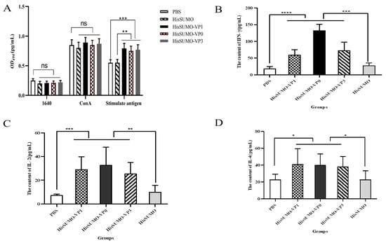 Interferons are an essential antiviral protein and are produced as a result of stronger cell-mediated immune responses in the fight against viruses like an FMD virus infection [35]. IFN-γ is one of the interferon types produced by the T cells and NK cells of the immune system. IL-2 and IL-4 are also involved in orchestrating the signaling pathway in virus recognition by cellular immunity and promote the proliferation of B cells. Therefore, our study demonstrated that the serum levels of IFN-γ induced by the HisSumo-VP1/HisSumo-VP0/HisSumo-VP3 fusion protein were higher than the His-SUMO control group. However, IL-2 and IL-4 were relatively secreted at low levels.