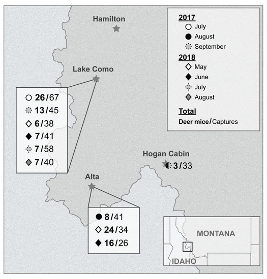 Four different locations were targeted over two years (2017 and 2018) (Figure 1). In 2017, small mammals were captured in and around two adjacent cabins, Hiker’s cabin (16–18 July) (46°03′56″ N 114°14′43″ W) and Wood’s cabin (6–8 September) (46°03′55″ N 114°14′40″ W) at Lake Como, Ravalli County, Montana. Two other locations were targeted in 2017, a private property near Alta, Montana (1–3 August) (45°37′09″ N 114°18′01″ W) and a forest service cabin near Lost Trail Pass, Montana called Hogan cabin (30 August–1 September) (45°42′49″ N 113°52′47″ W). The following summer, 2018, only two locations were targeted from the previous summer: Alta and Lake Como. The Alta site was visited twice, 14–16 May and 4–6 June. Trapping at Lake Como occurred 23–25 May, 20–22 June, 25–27 July, and 22–24 August. During the second summer, no traps were set inside either Hiker’s or Wood’s cabin at Lake Como.