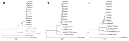 (a) Phylogenetic tree of 1121 bp of the L segment, (b) tree of 2088 bp of the M segment, and (c) tree of 1641 bp of the S segment of Bitterroot Valley Sin Nombre orthohantavirus (SNV) sequences compared to other SNV sequences throughout the western United States. The trees were inferred using the neighbor-joining method based on the Tamura-Nei model. Bootstrap percentages (1000 replicates) above 70% are shown next to the branches. The branch lengths are the number of base substitutions per site. GenBank submission numbers are listed in parentheses. Analyses were conducted in Geneious Prime 11. HNTV = Hantaan virus, PHV = Prospect Hill virus.