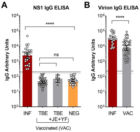 TBE NS1 and virion IgG ELISA with serum samples from flavivirus-negative individuals as well as TBE vaccinees and TBE patients. (A) Quantitative analysis of NS1-specific IgG antibodies of human serum samples after TBEV infection without a history of vaccination (INF, n = 26), after TBE vaccination (TBE, n = 42), after TBE, JE and YF vaccination (TBE + JE + YF, n = 6), and negative in TBE NTs (NEG, n = 27). (B) TBE virion IgG ELISA with all samples from TBE patients (INF, n = 26) and TBE vaccinees (VAC, n = 48). Data represent geometric means with 95% confidence intervals. Significance was determined with (A) ANOVA with Dunnett’s multiple comparisons test or (B) t test. ns, not significant; ****, p < 0.0001. Cut-off positive: solid line, cut-off equivocal: dashed line. TBE, tick-borne encephalitis; JE, Japanese encephalitis, YF, yellow fever; INF, infected, VAC, vaccinated; NEG, negative.